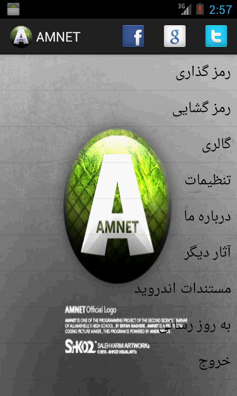 امنت یک اپلیکیشن اندروید میباشد که برای رمز گذاری متن در عکس به طوری که عبارت مورد نظر شما در عکس انتخابی تان رمز گذاری میشود و بد از رمز گذاری هم تغییری در عکس دیده نمیشود ، سپس شما میتونید عکس رمز گذاری شده رو باMMS ،Mail ، Facebook و ... با دوستاتون به اشتراک بگذارید و اون دستگاه مقصد هم فقط با داشتن همین نرمافزار میتواند عکس رمز گذاری شده را رمز گشایی کند .
